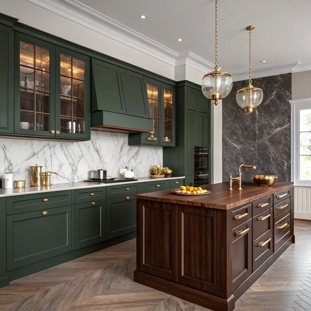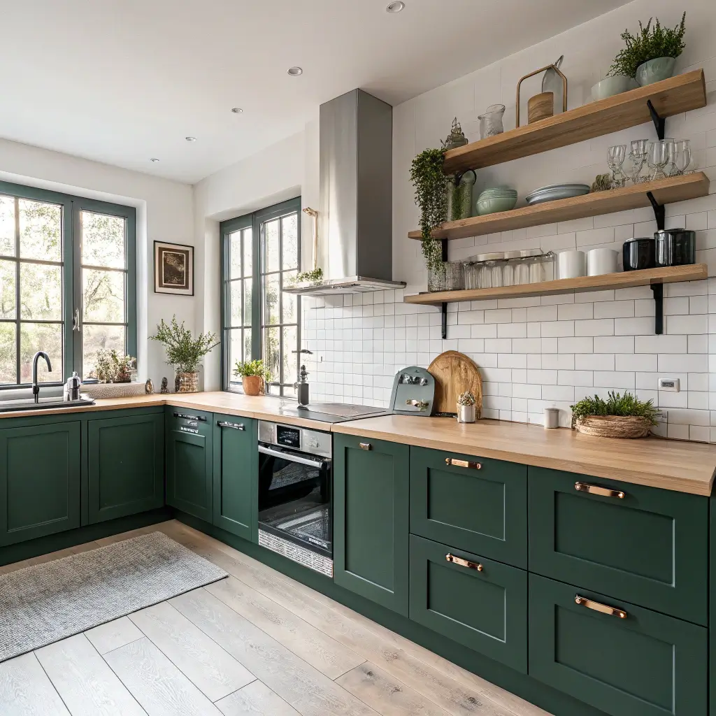 What makes this combo sing? The contrast between deep green and light wood creates visual interest without overwhelming the space. Think ash wood floating shelves against those green cabinets, or maybe a light oak breakfast bar. The key here is keeping the wood accents minimal but impactful.