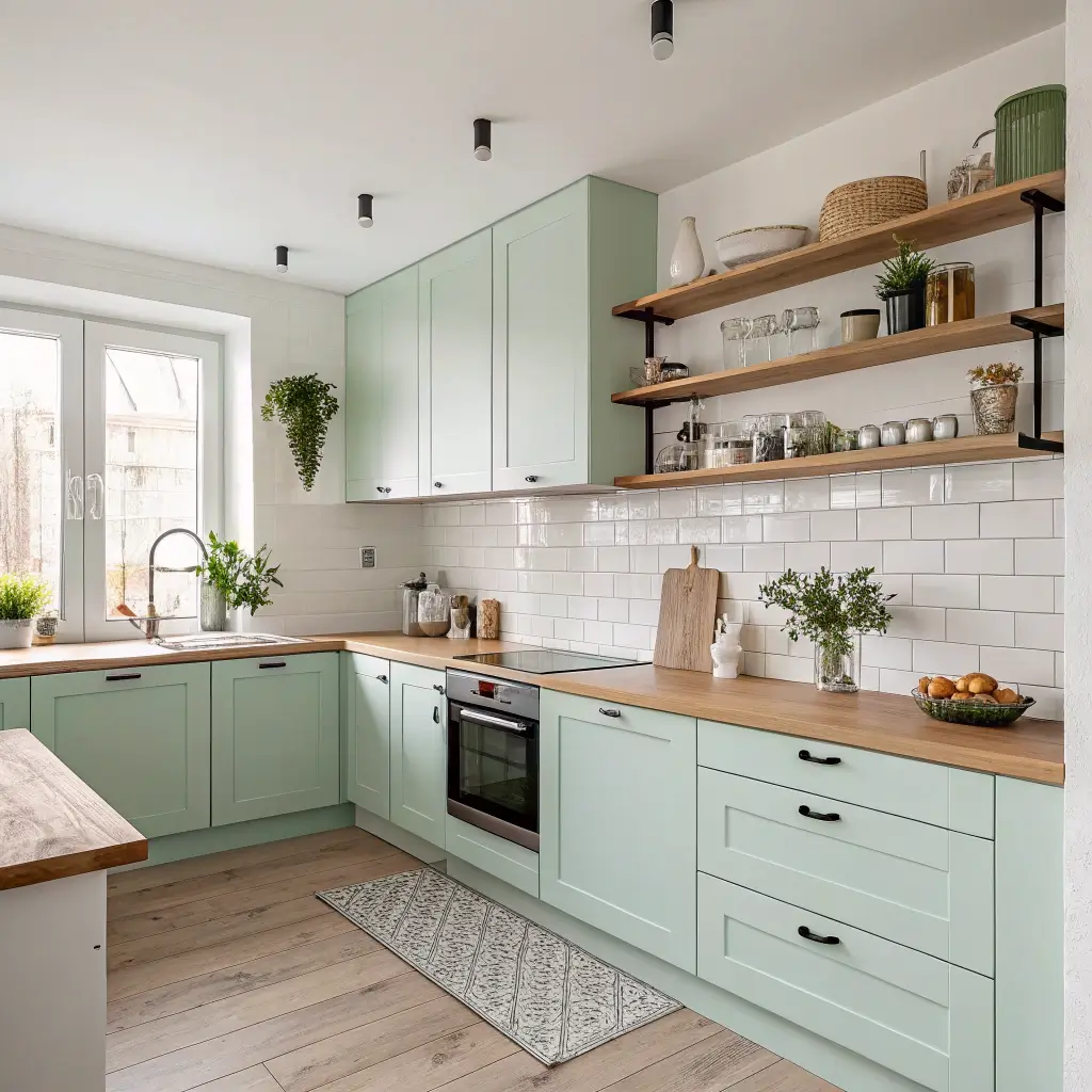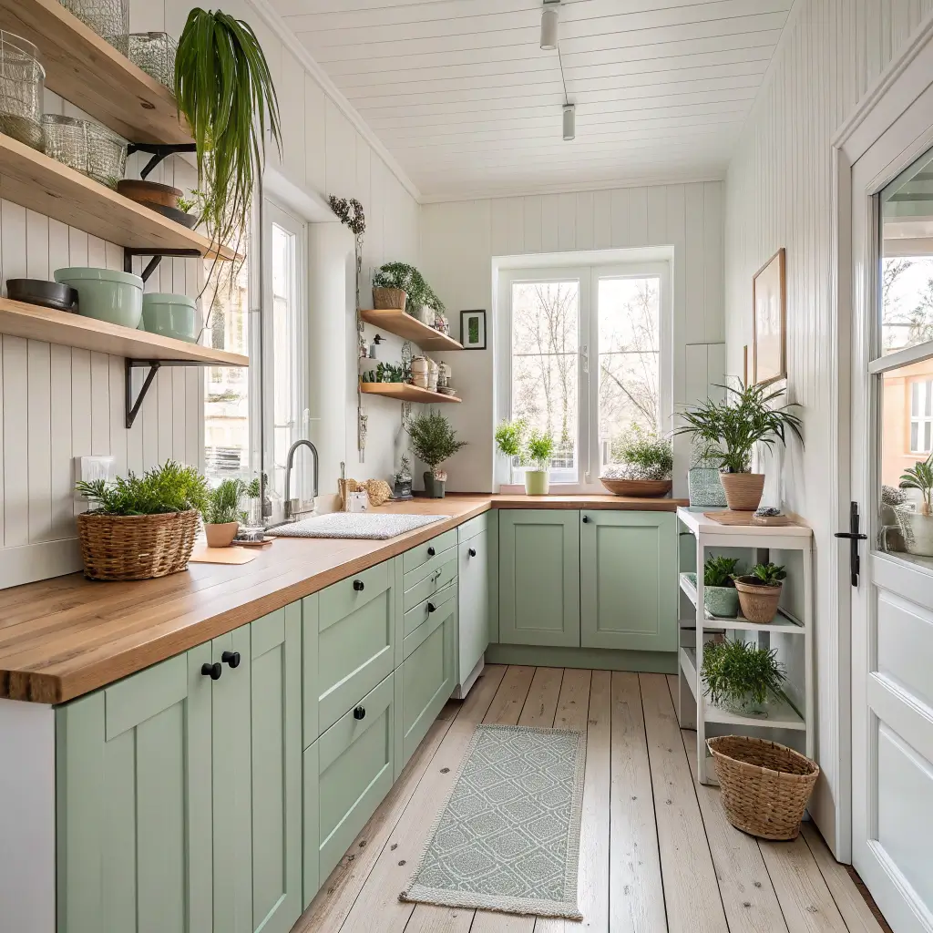 Scandinavian design meets color! While traditional Scandi kitchens stick to whites and grays, adding soft green with pine wood creates warmth without sacrificing that clean Nordic aesthetic. Think functionality first, beauty second – except both happen simultaneously here.