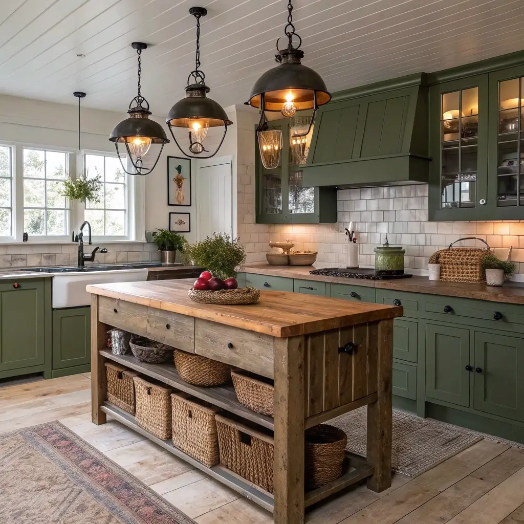 Nothing says farmhouse quite like butcher block countertops, and pairing them with sage or olive green cabinets creates that perfect rustic-meets-refined balance. Butcher block brings warmth and functionality – you can literally chop directly on certain sections!
