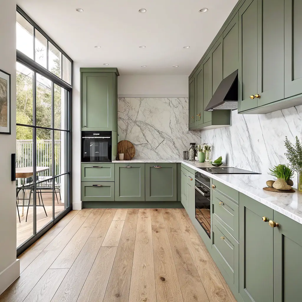 Olive green cabinets grounded by light oak flooring create a sophisticated Mediterranean vibe without the plane ticket. This earthy combination feels both trendy and timeless – a rare achievement in kitchen design.