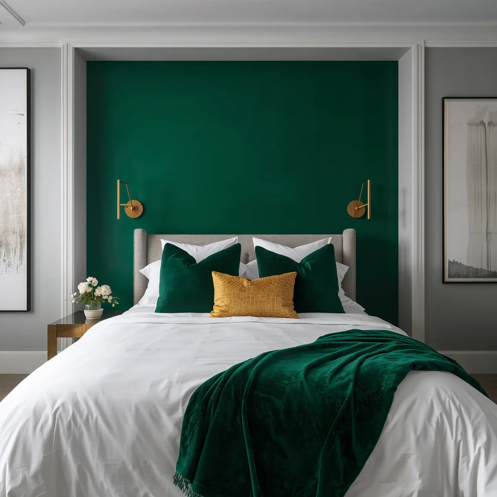 Pick the wall behind your headboard – it’s the natural focal point anyway. Go bold with a true emerald green, not some wishy-washy in-between shade. Sherwin-Williams’ Emerald or Benjamin Moore’s Chrome Green work beautifully. Then keep the other walls white or very light gray to let that green wall be the star.