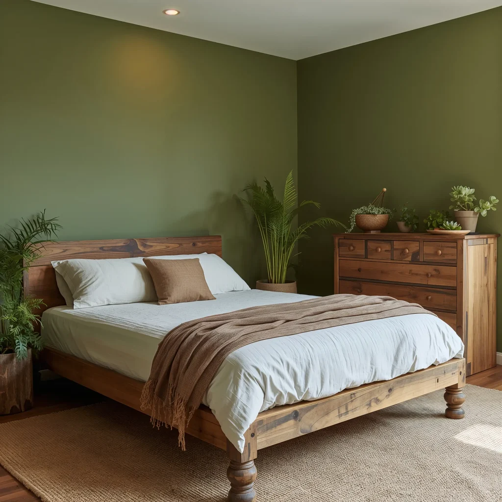 Start with a dark green accent wall behind your bed. Paint it in something like Benjamin Moore’s Hunter Green or Farrow & Ball’s Studio Green. These colors create instant drama without overwhelming the space. Then layer in natural wood furniture – think raw oak nightstands or a live-edge headboard if you’re feeling fancy.