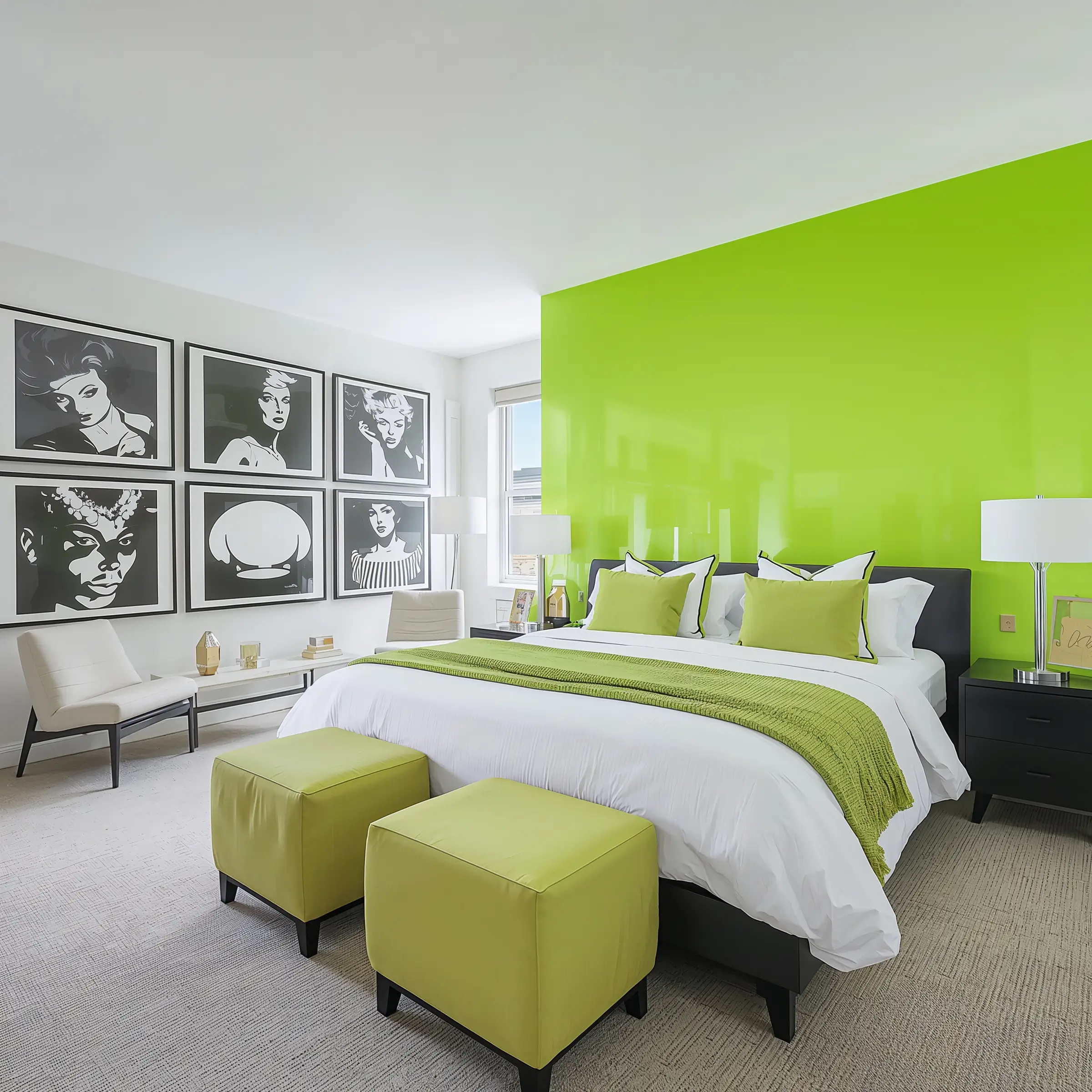 Pick the wall behind your headboard – it’s the natural focal point anyway. Go bold with a true emerald green, not some wishy-washy in-between shade. Sherwin-Williams’ Emerald or Benjamin Moore’s Chrome Green work beautifully. Then keep the other walls white or very light gray to let that green wall be the star.