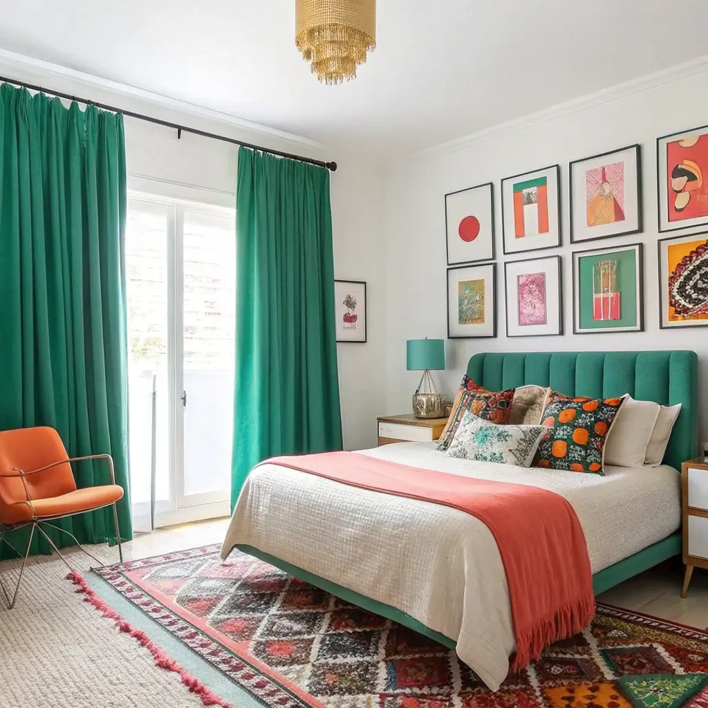 The bedroom of my best friend features stunning emerald velvet curtains against charcoal gray walls. She kept everything else minimal – white bedding, black nightstands, a single abstract art piece. The result? Absolutely stunning without feeling like a color bomb exploded.