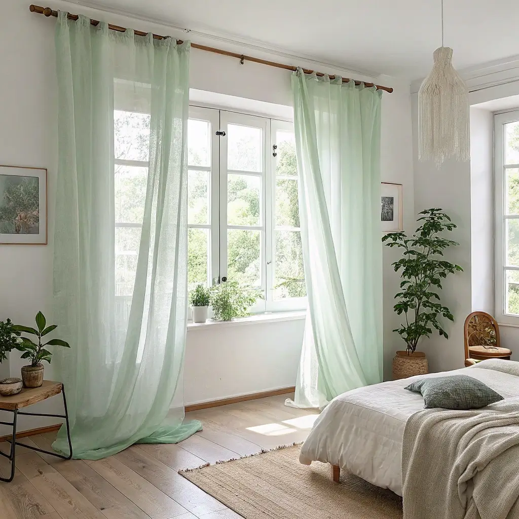 Pro tip I wish someone had told me earlier: Layer airy sheers with heavier curtains for flexibility. During the day, tie back the heavier panels and let the airy greens filter the light. At night, close everything for privacy and light control.