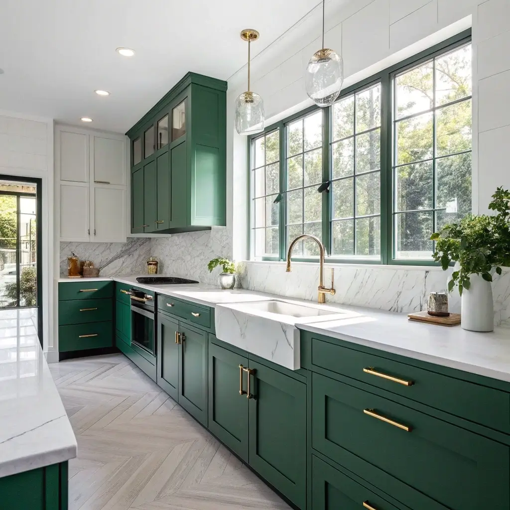 This combination screams luxury, and I’m here for it. Dark green cabinets paired with gold or brass handles create this rich, sophisticated look that feels both classic and contemporary. The warmth of gold prevents the dark green from feeling too cold or severe.