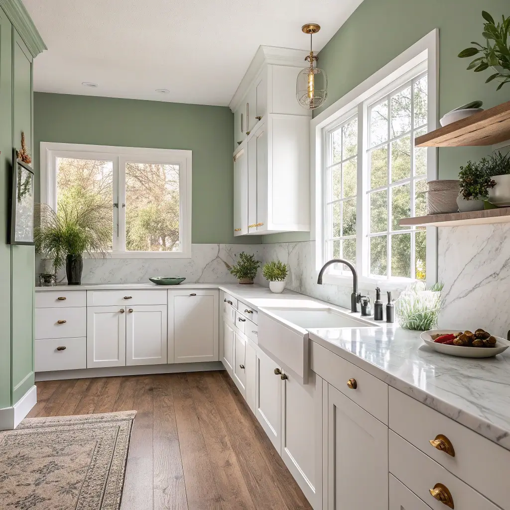 Sage Green Kitchen Wall with White Cabinets