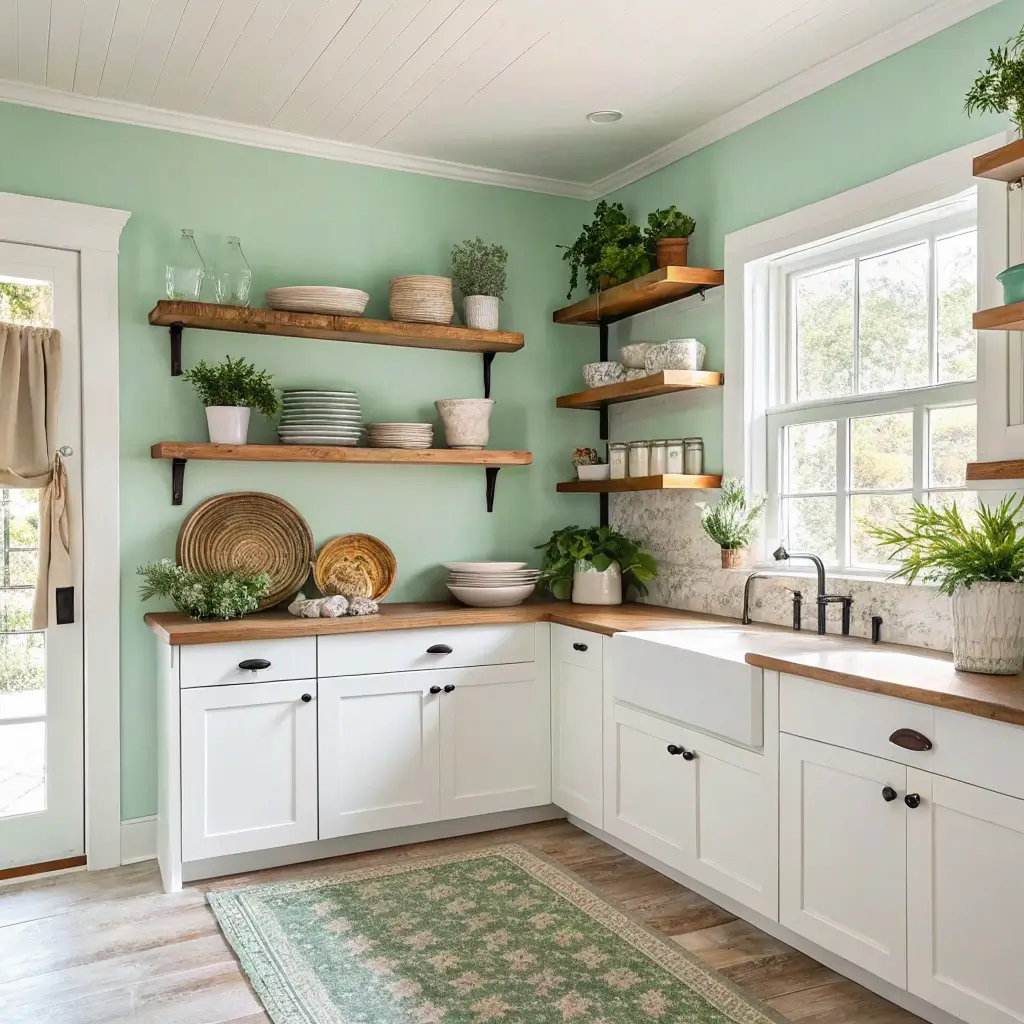 Mint Green Kitchen Walls with Wooden Shelves