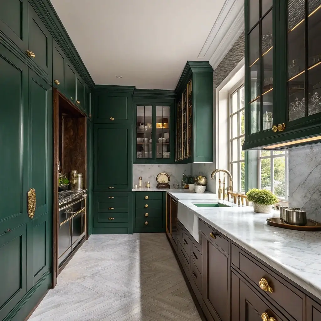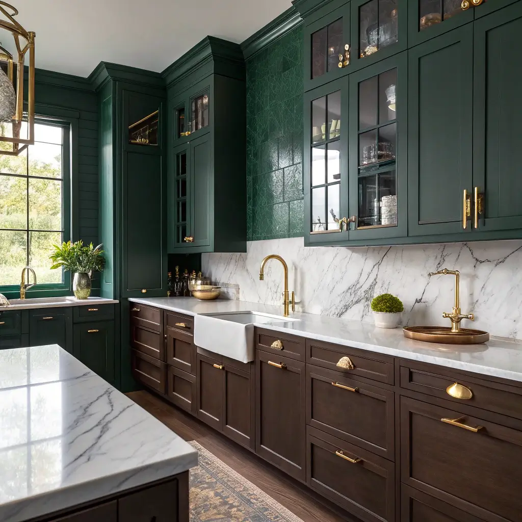 Ready to go bold? Dark green walls with gold fixtures scream luxury without trying too hard. This combination transforms even the smallest kitchen into something that feels expensive and intentional.