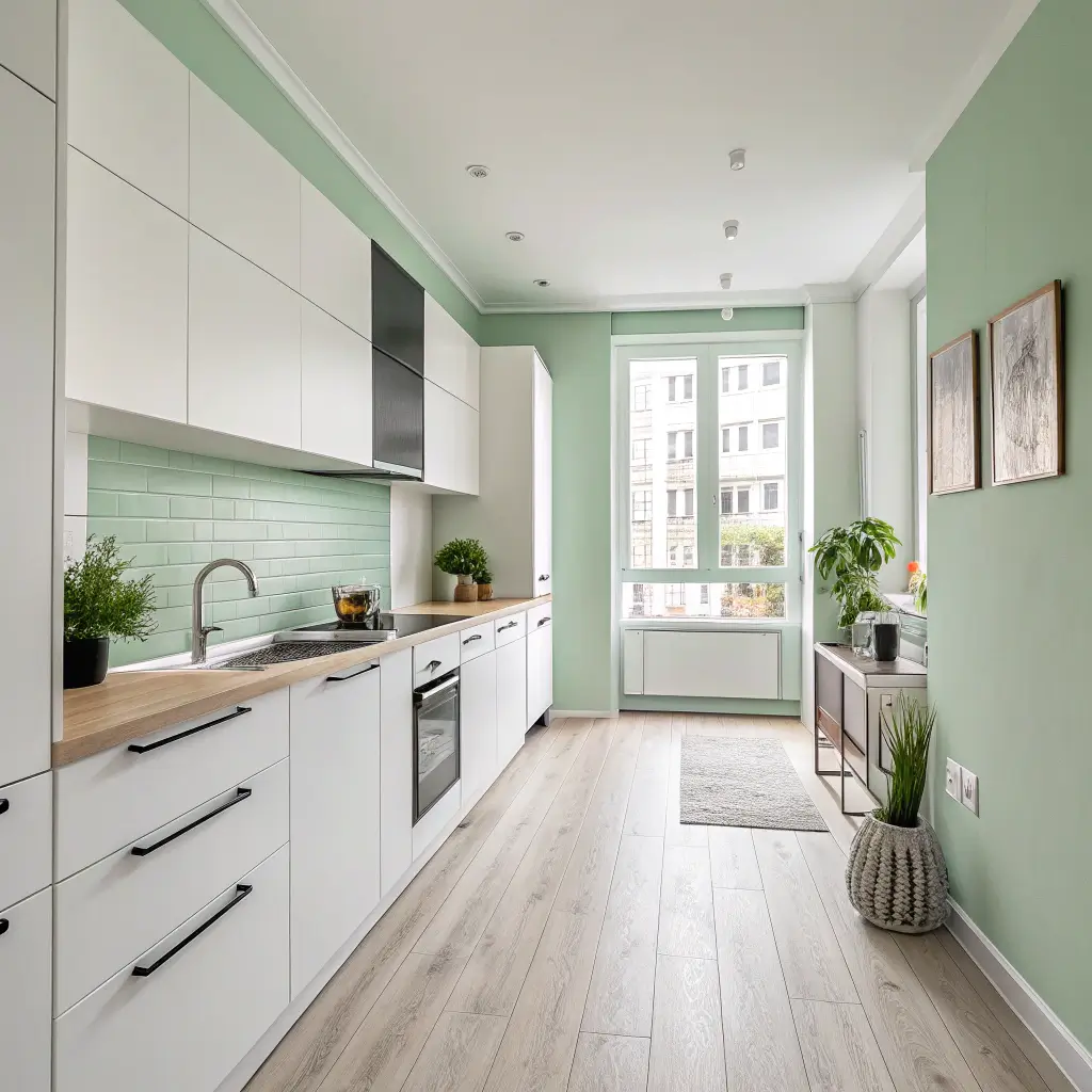 Pastel Green Walls in Minimalist Kitchen