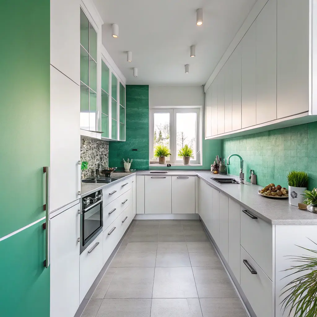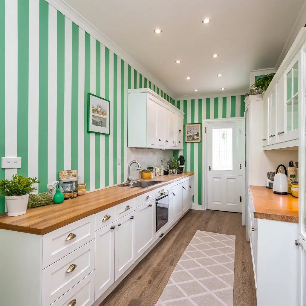 Okay, stripes might sound crazy, but hear me out! Green and white striped walls can completely transform your kitchen’s proportions. Vertical stripes make low ceilings feel higher, while horizontal ones can make narrow kitchens feel wider.