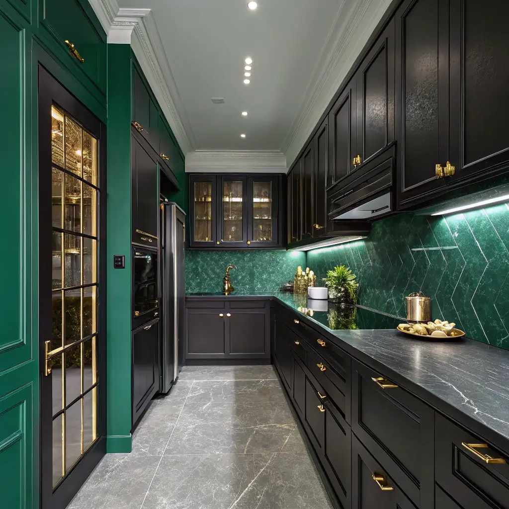 The contrast between the rich emerald and the black creates such visual interest. Your kitchen becomes the kind of space where people actually want to hang out during parties instead of awkwardly clustering in the hallway.