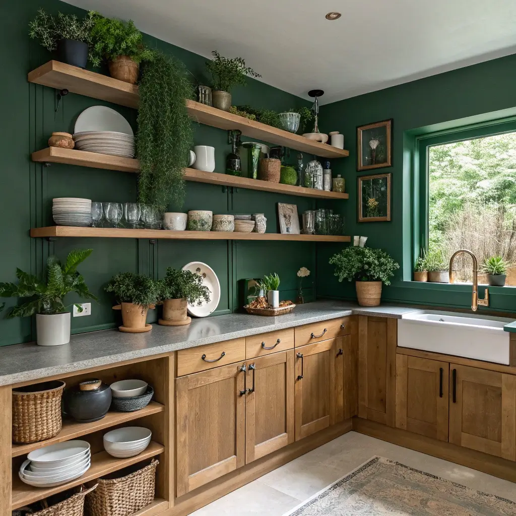 Remember, open shelving means everything’s on display. But with forest green as your backdrop, even your mismatched mugs look intentional!