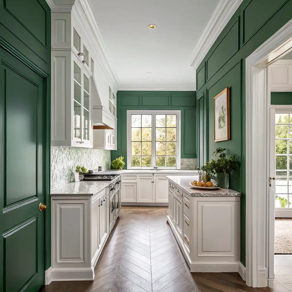 Why settle for one green when you can have two? Two-tone green walls with contrasting trim create architectural interest where there might not be any. It’s like giving your kitchen a makeover without changing the bones.