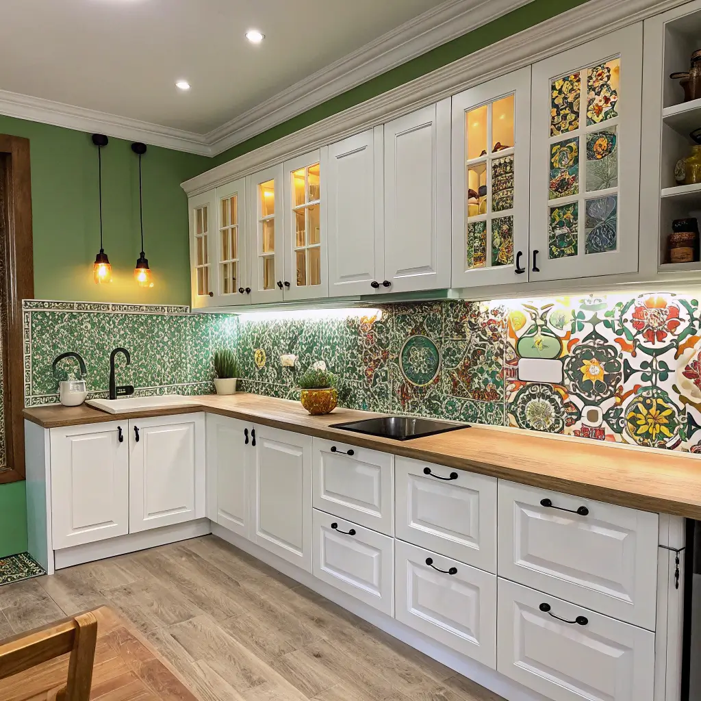 Green walls provide the perfect canvas for a show-stopping patterned backsplash. Think Moroccan tiles, geometric patterns, or vintage-inspired designs. The solid green lets the pattern shine without creating visual chaos.
