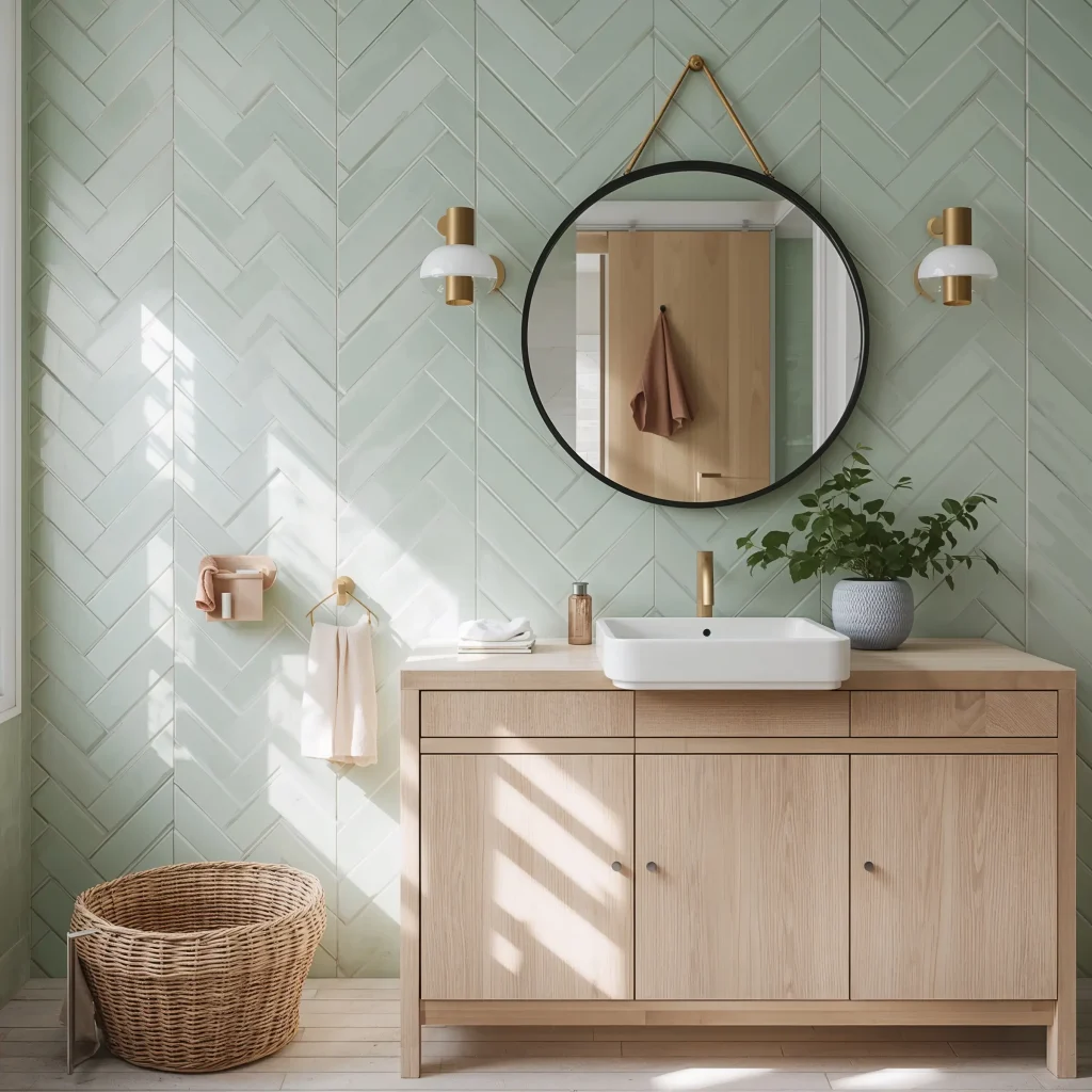 Sage green herringbone might just be the most sophisticated pattern you can pull off without looking like you’re trying too hard. Ever noticed how herringbone makes everything look expensive? Combine that with sage green, and you’ve got yourself a bathroom that whispers “I read design blogs for fun.”