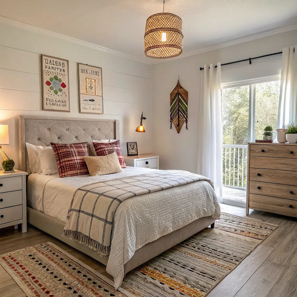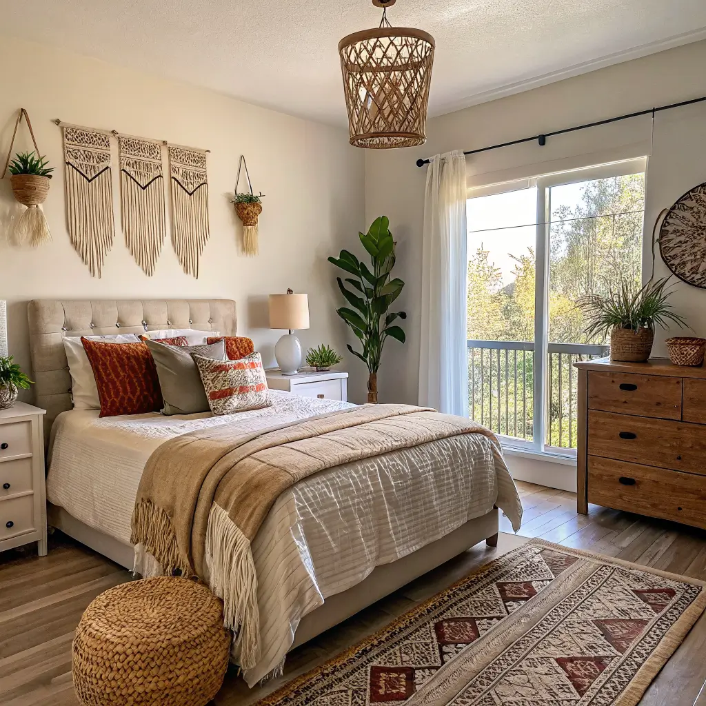 Layer, layer, and layer some more – that’s the boho mantra. Start with a low platform bed or even a mattress on the floor (intentionally, not because you’re broke). Pile on textiles with different patterns and textures: Moroccan rugs, macramé wall hangings, and enough throw pillows to build a fort.