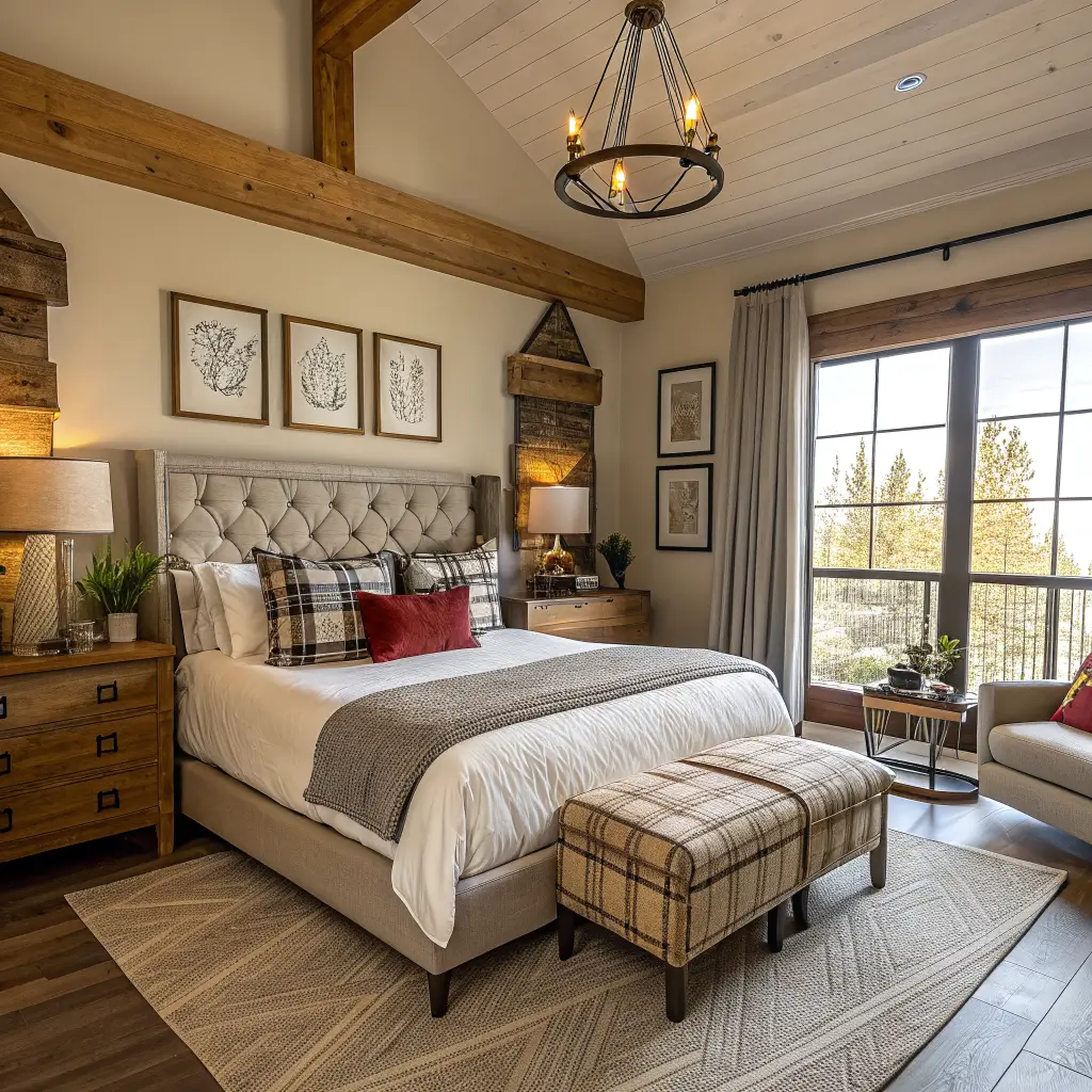Start with one statement rustic piece – maybe a reclaimed wood headboard or exposed beam (faux beams totally count). Build around it with softer elements: plush bedding, modern lighting, and maybe one industrial accent like a metal side table.
