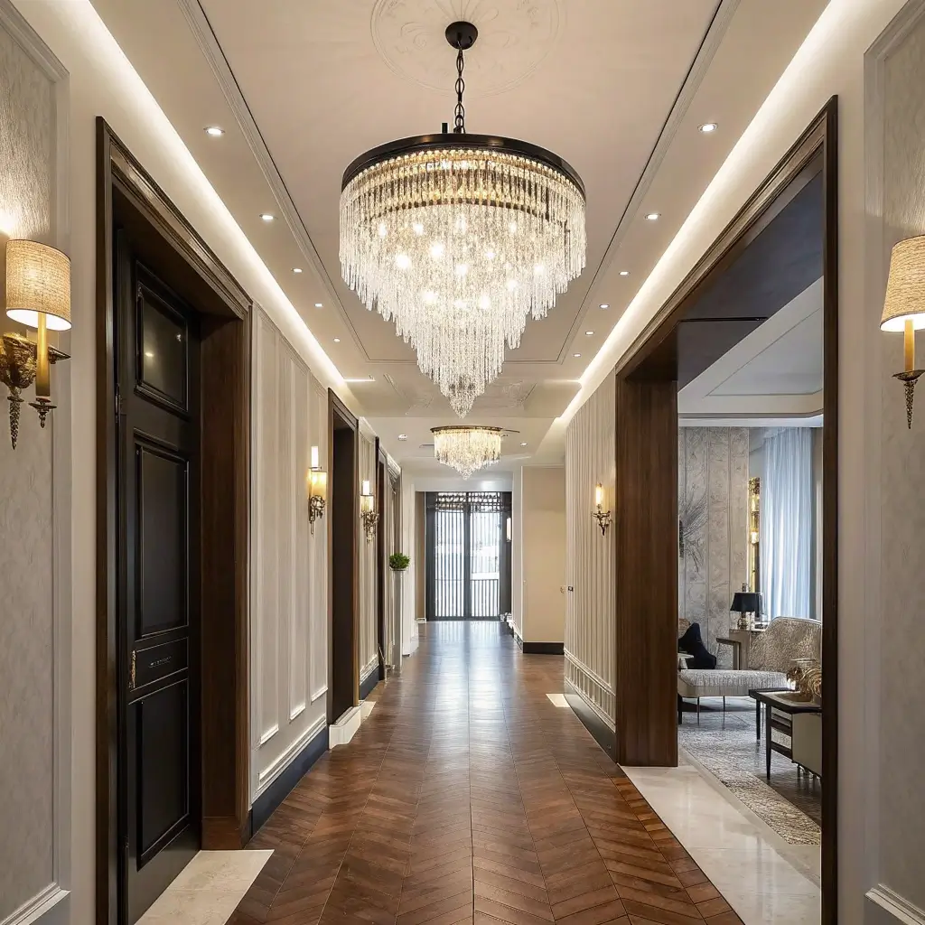 Let’s talk luxury. Crystal fixtures in hallways make every trip to the bathroom feel like a red carpet moment. And before you worry about price tags, modern crystal alternatives deliver the sparkle without the investment.