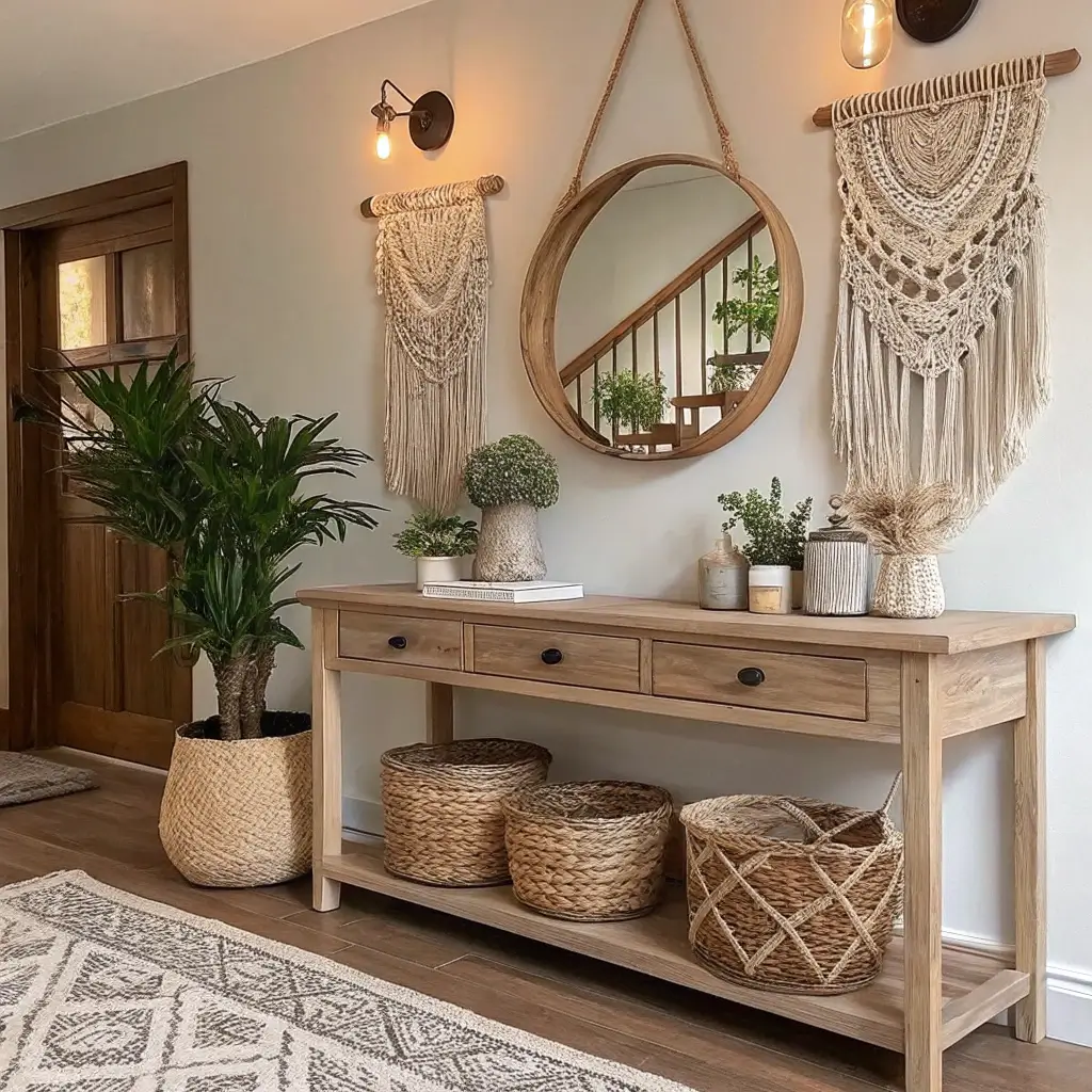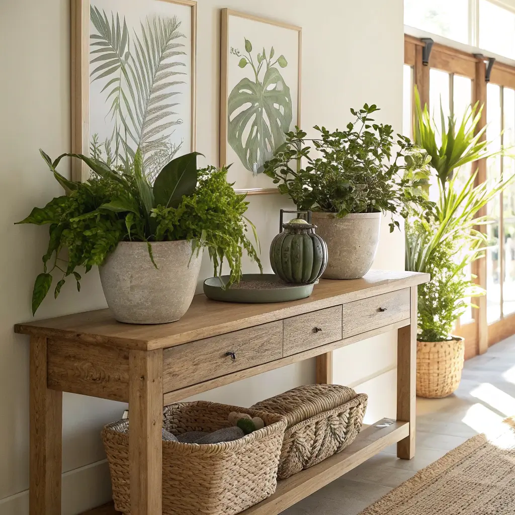 The nature theme extends beyond just plants though. Think about incorporating natural wood elements, stone accessories, or even a small water feature if you’re feeling adventurous. The goal? Bringing the outside in without turning your hallway into a greenhouse.