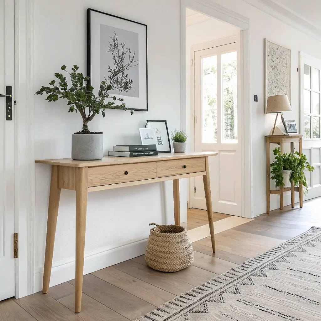 Scandinavian design and minimalism go together like coffee and mornings. The focus on functionality, natural materials, and clean lines makes this style perfect for hallway tables that need to work hard but look effortless.