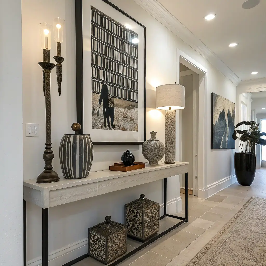 Why scatter small art pieces when you can make one big statement? A single artistic element as your hallway table’s focal point creates instant sophistication without the visual noise.