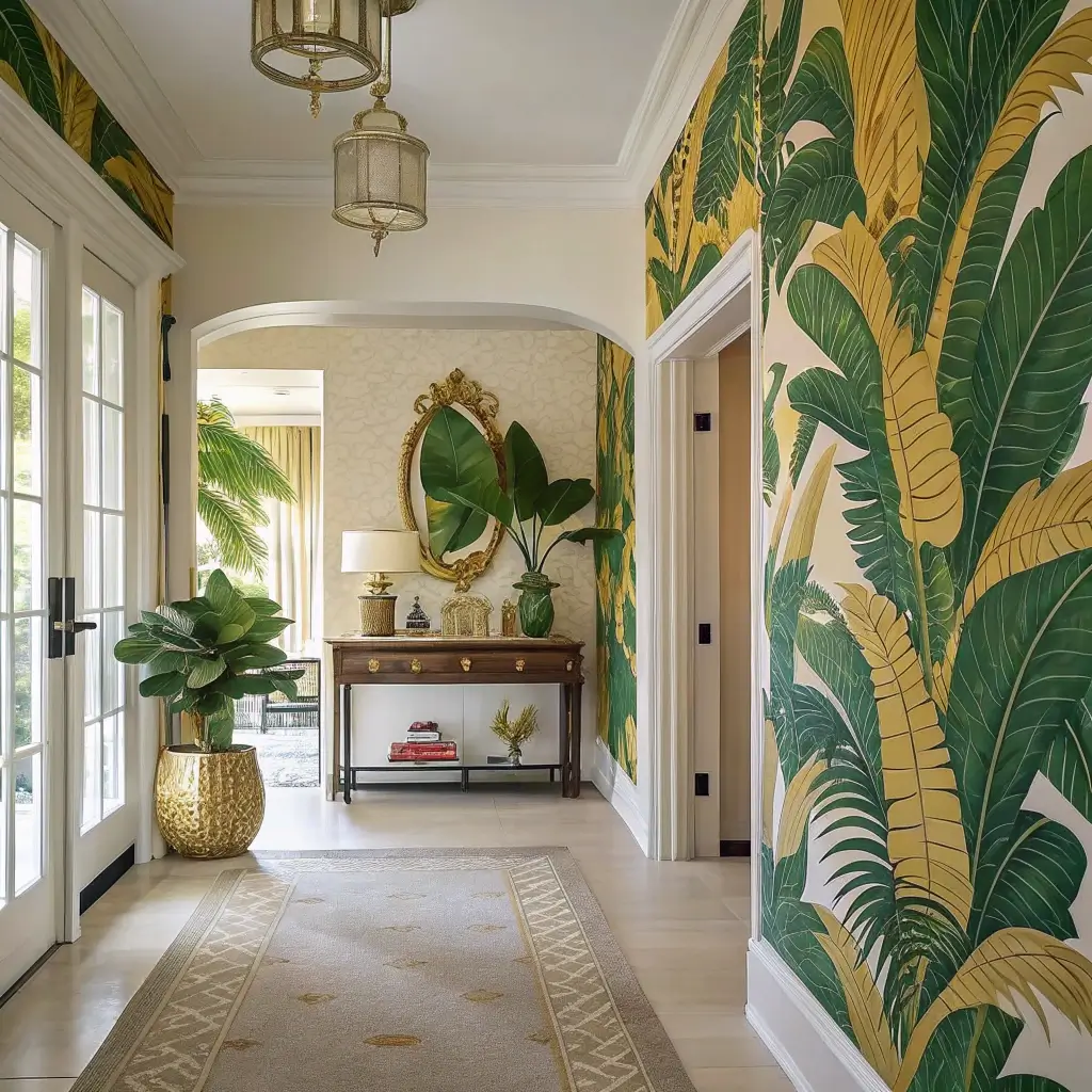 Who says hallways can’t feel like secret gardens? Bold botanical wallpaper brings nature indoors in the most dramatic way possible. We’re talking oversized leaves, trailing vines, and flowers that demand attention—basically, everything your actual houseplants wish they could be.