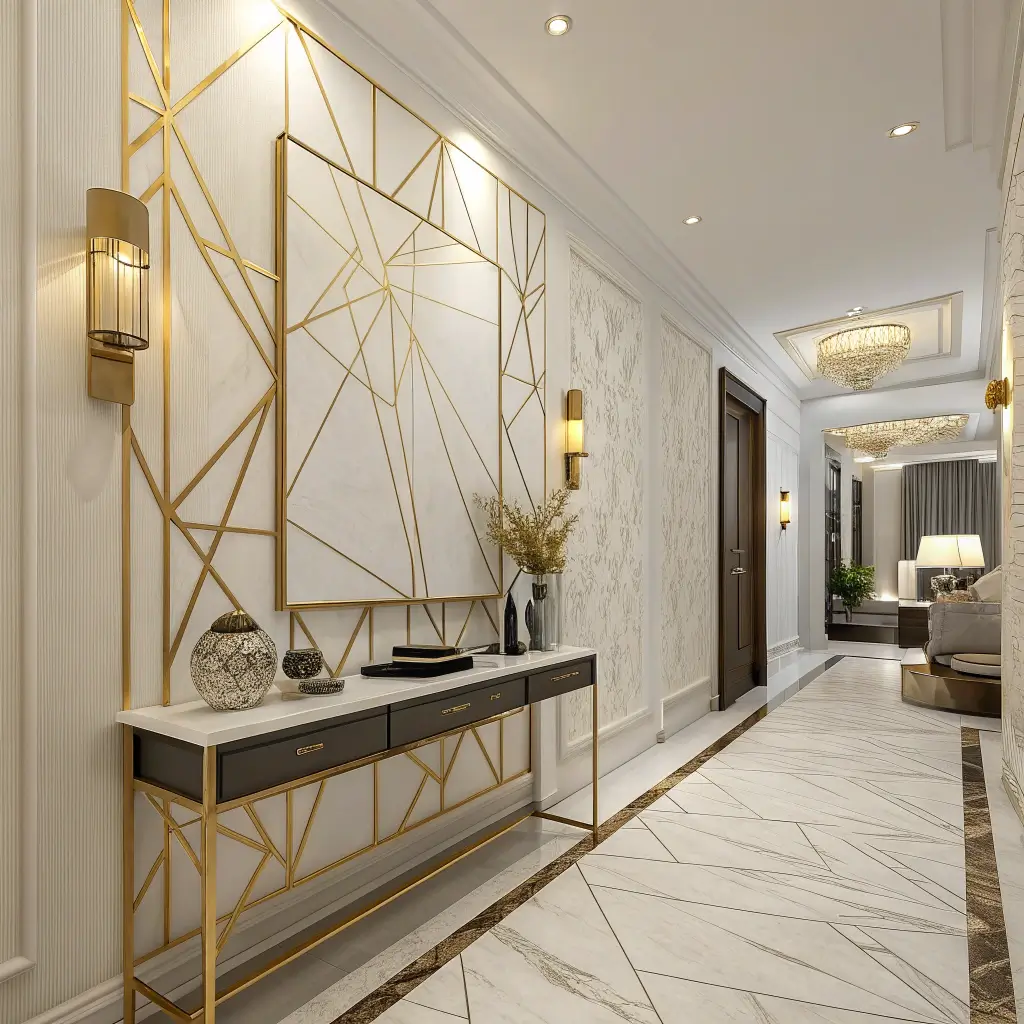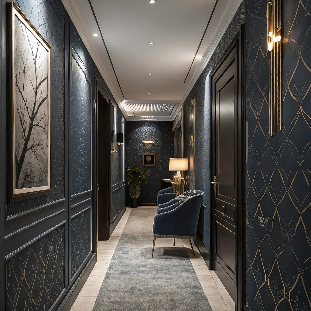 Now, before you go covering every wall in gold—don’t. This works best as an accent, maybe on one end wall or in an alcove. Think of it like jewelry for your hallway; a little goes a long way. Too much and you’ll feel like you’re living inside a chocolate wrapper 🙂