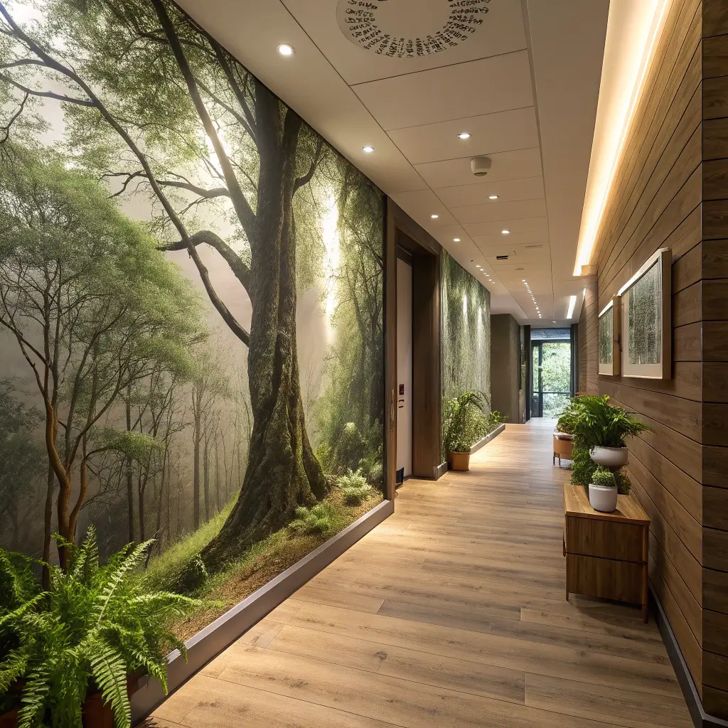 What works best? Choose murals with depth and perspective that complement your hallway’s proportions. Long corridors benefit from horizontal forest scenes, while dead-end hallways love those path-through-the-trees designs that create infinite depth.