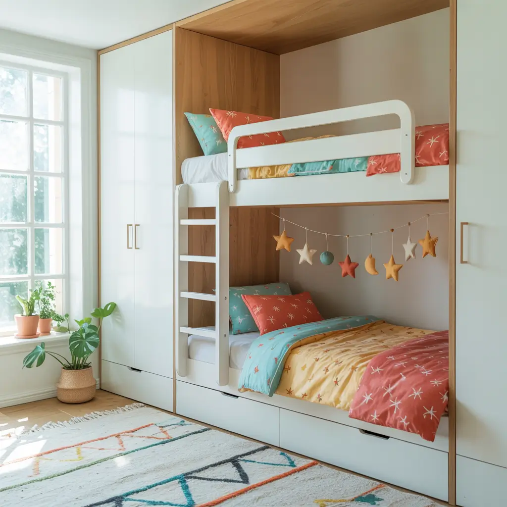 This combo changed my life when we moved into our smaller apartment. Picture this: a bunk bed with built-in wardrobe space underneath or alongside it. Genius, right? My kids get their sleeping space up top, and all their clothes hide neatly below.