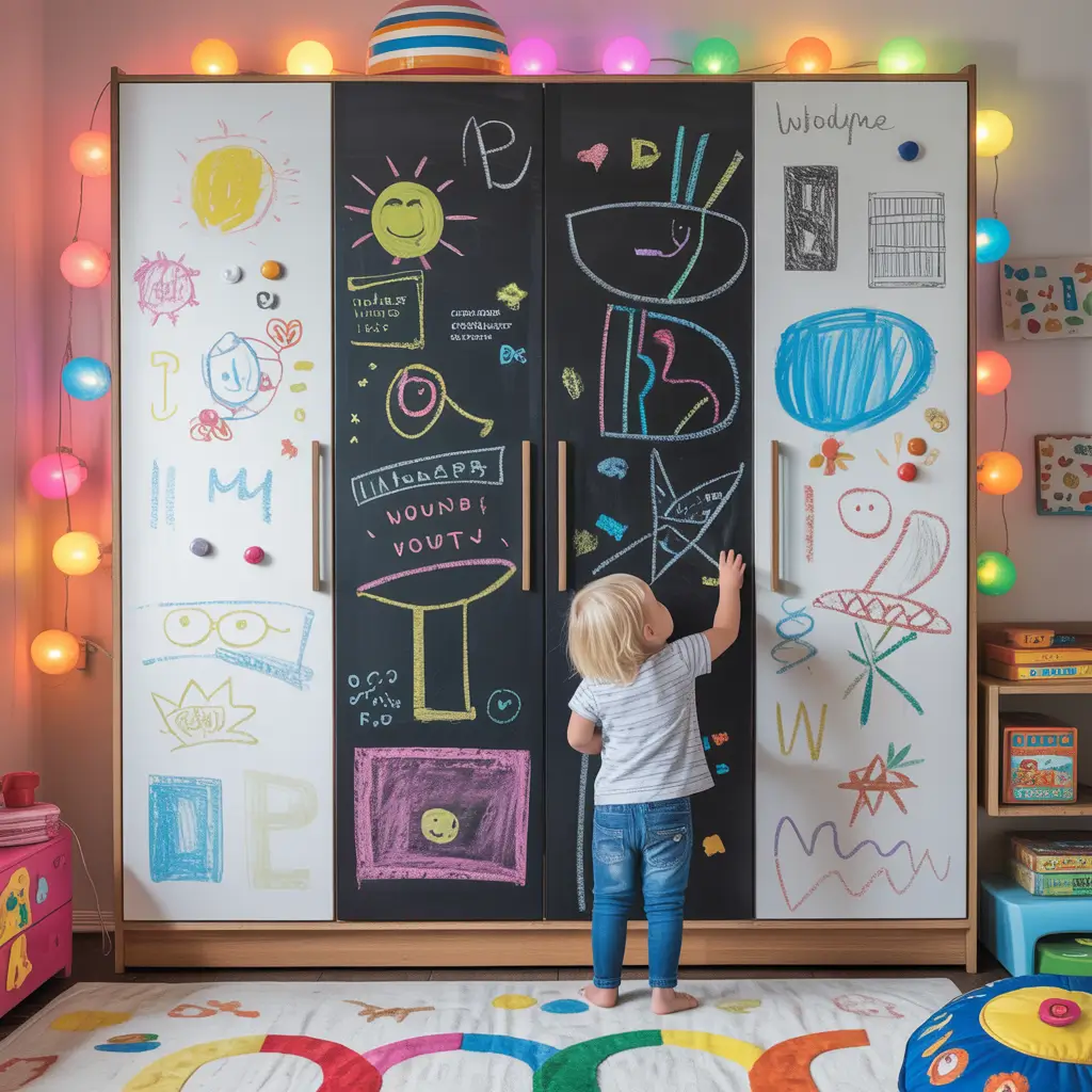 Transform wardrobe doors into creative canvases with chalkboard or whiteboard paint. This simple addition turns boring storage into an interactive art station, message board, or homework helper.