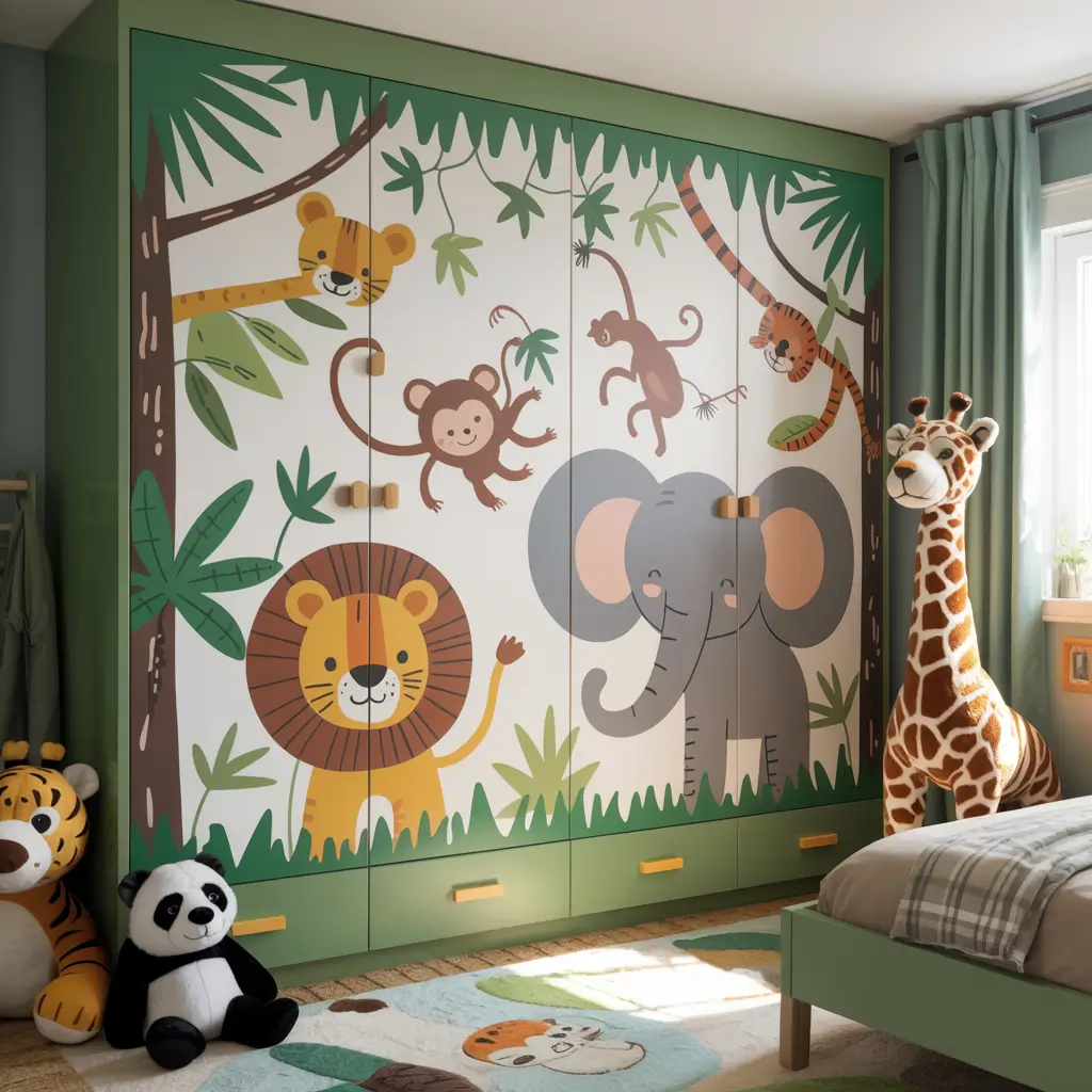 Bring the wild indoors with jungle and animal-themed wardrobes. These designs transform storage into safari adventures, complete with vine-wrapped handles and animal silhouettes.
