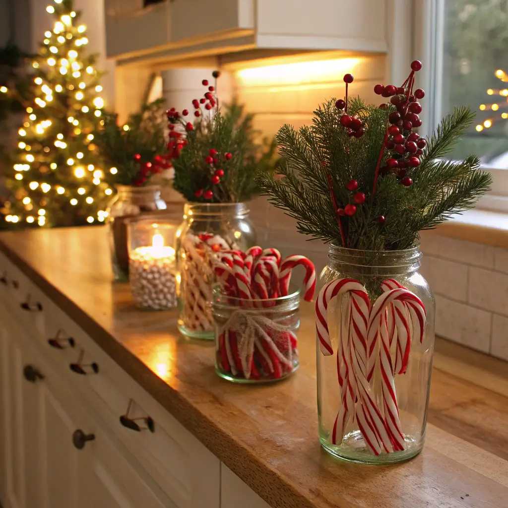 Grab mason jars of different sizes (variety is the spice of life, right?). Line the inside edges with candy canes, securing them with a rubber band hidden by ribbon. Fill the center with anything festive – cranberries, silver bells, or even battery-operated candles for that cozy glow.