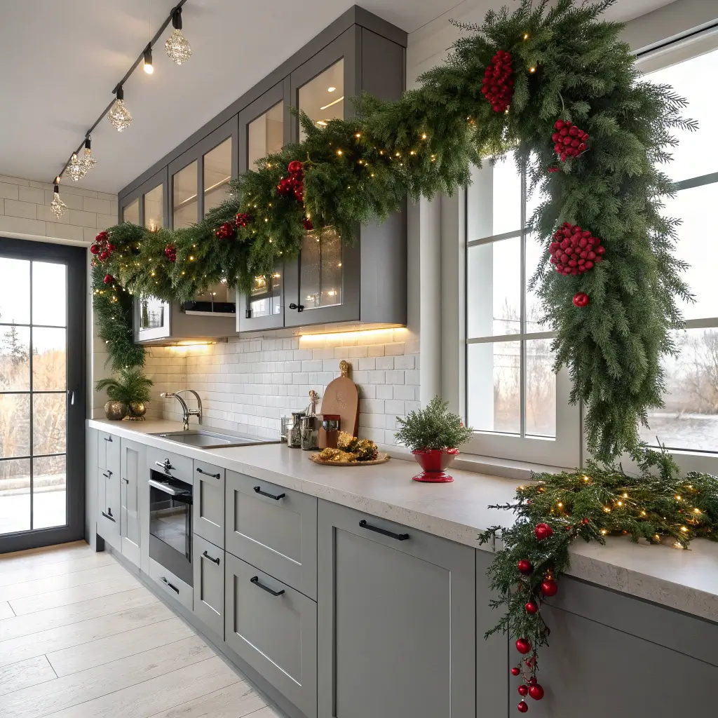 Choose garland that complements your kitchen’s color scheme. Got white cabinets? Go for traditional green with red berries. Dark wood? Try frosted garland with silver accents. The key is securing it properly – command strips are your best friend here.