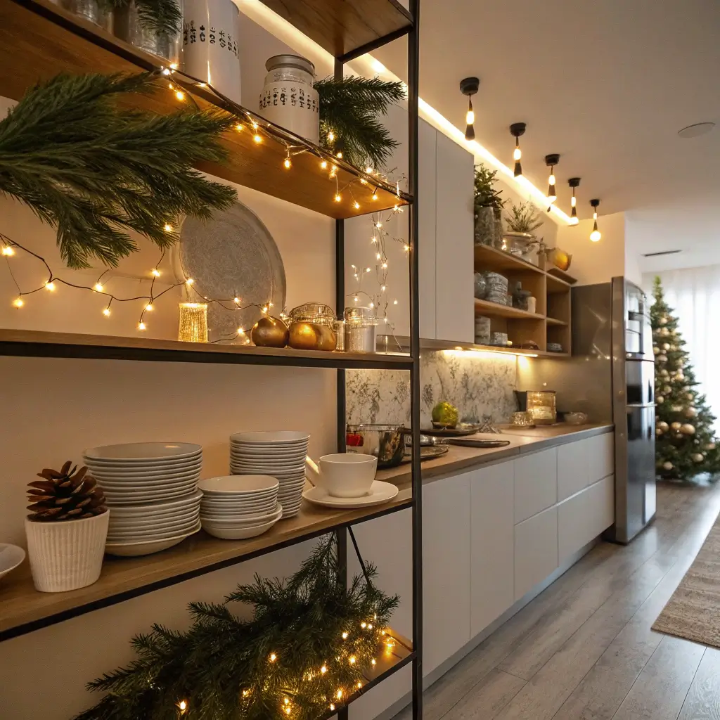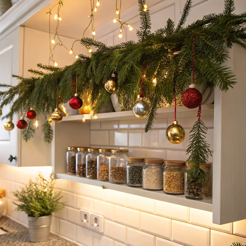 Start from the corners and work your way in, creating gentle swags between attachment points. Weave battery-operated lights through the garland (trust me, you don’t want cords dangling near your stove). Add lightweight ornaments every foot or so for extra sparkle.