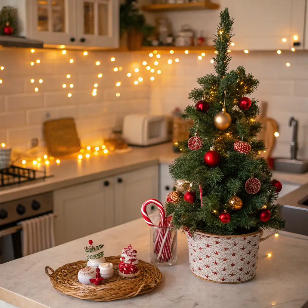 Position your tree where it won’t interfere with cooking but stays visible. Corner of the counter near the coffee maker? Perfect. That dead space between the microwave and wall? Even better.