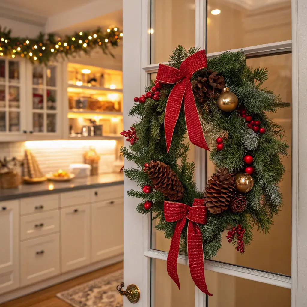 Your pantry door is prime decorating real estate that everyone ignores. Hanging a festive wreath here adds unexpected charm and makes opening the pantry feel like unwrapping a present every time.