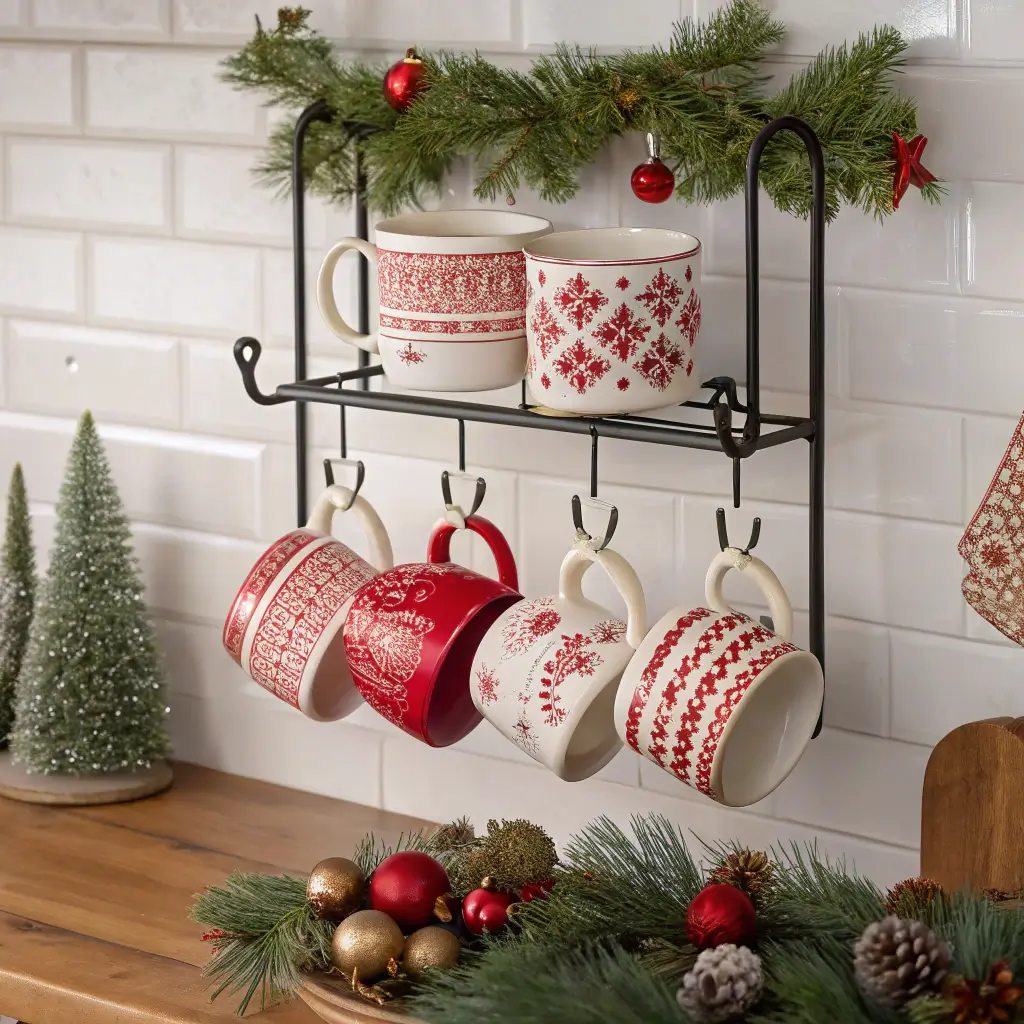 Install decorative hooks (command strips work if you’re renting) in a pattern on an empty wall. Arrange mugs by color or design theme. Weave garland or ribbon between hooks for cohesion. The result? Practical storage that doubles as festive decor.