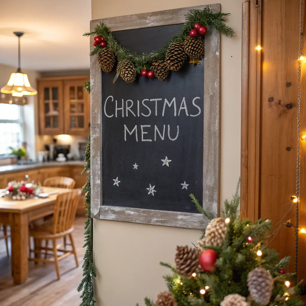 A festive chalkboard menu sign combines decoration with communication – genius, right? Whether listing dinner plans or countdown days until Christmas, it keeps everyone informed while looking adorable.
