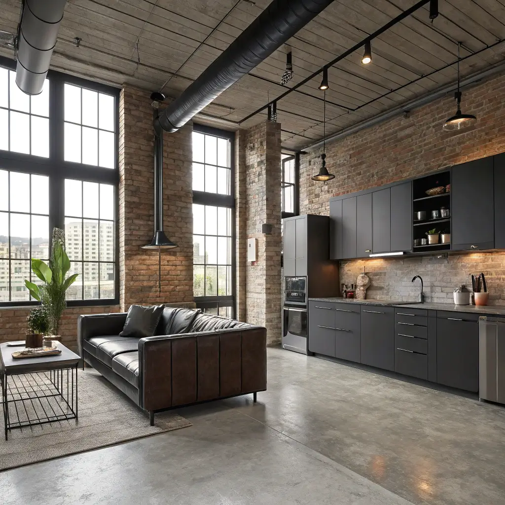 The kitchen becomes a functional workshop vibe—think stainless steel appliances, concrete or butcher block countertops, and metal pendant lights that look like they could’ve hung in a 1920s factory. The living area mirrors this with leather sofas, metal-framed furniture, and perhaps a bookshelf made from pipe fittings and reclaimed wood.