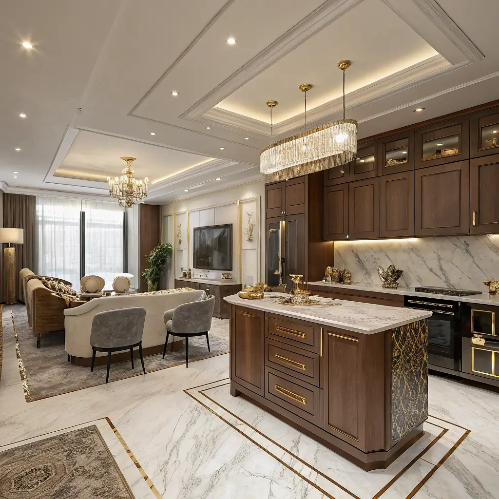 The trick with luxury materials is using them strategically rather than covering every surface. A waterfall marble island becomes the stunning centerpiece of your kitchen, visible from the living area and serving as a natural gathering spot. Meanwhile, wood adds warmth and prevents the space from feeling like a hotel lobby.
