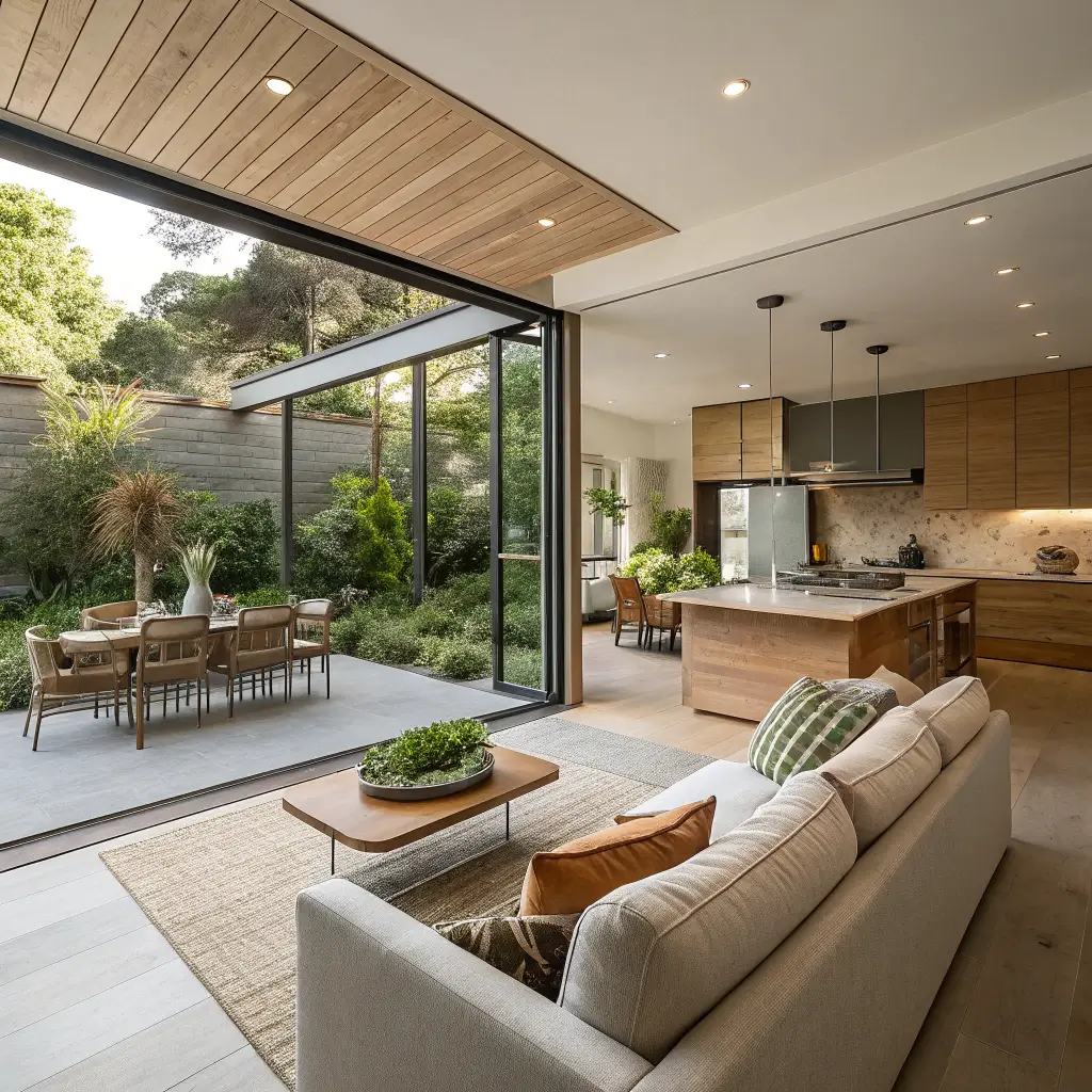 The goal is making your outdoor space feel like a natural extension of your interior. This starts with large glass doors—sliding, folding, or pivot—that can open completely to merge spaces. When weather permits, your open concept kitchen living room effectively doubles in size.