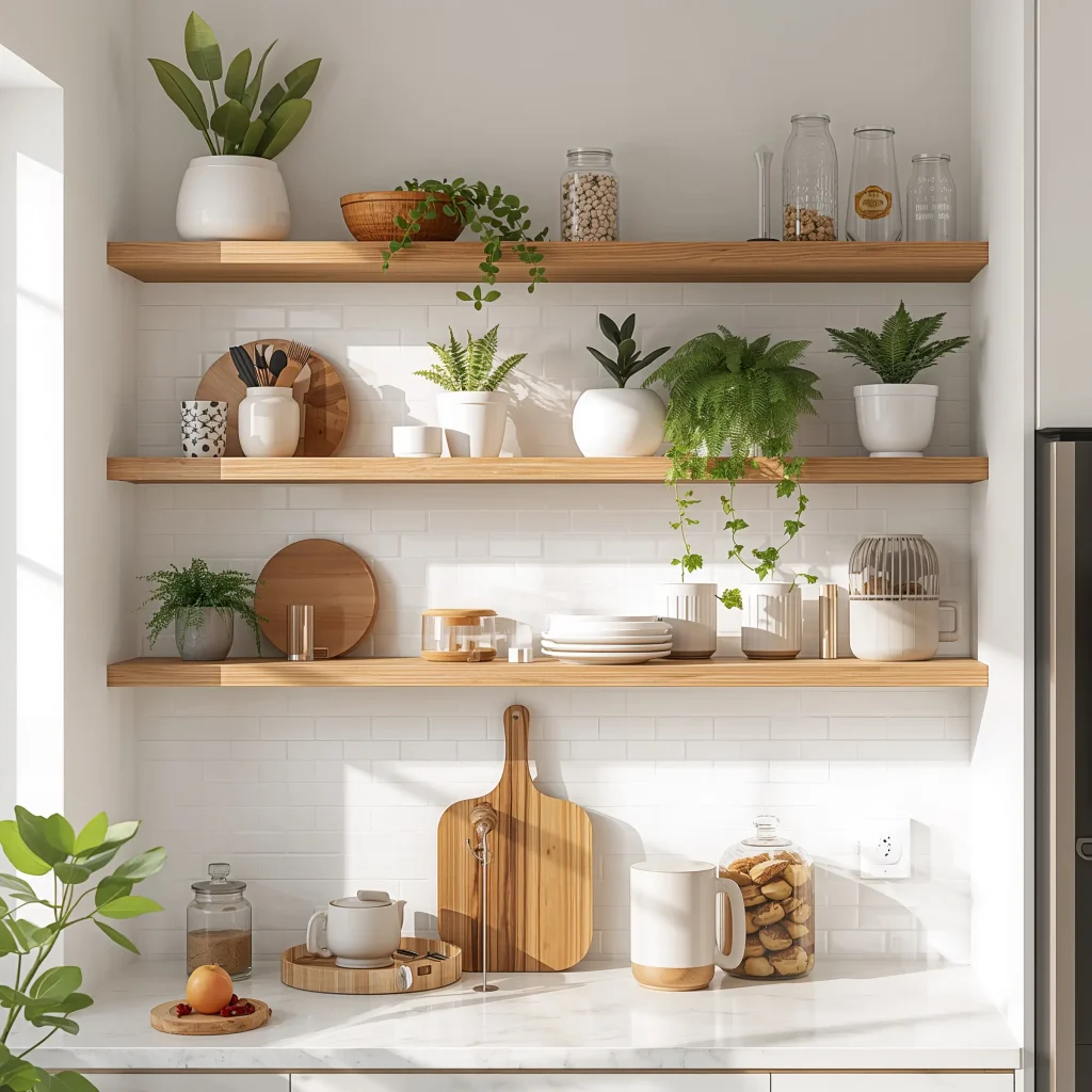 Let me start with my absolute favorite – floating wooden shelves packed with plants. I installed these bad boys three years ago, and they completely changed the game. You know that awkward wall space between your upper cabinets and countertop? That’s prime real estate right there.