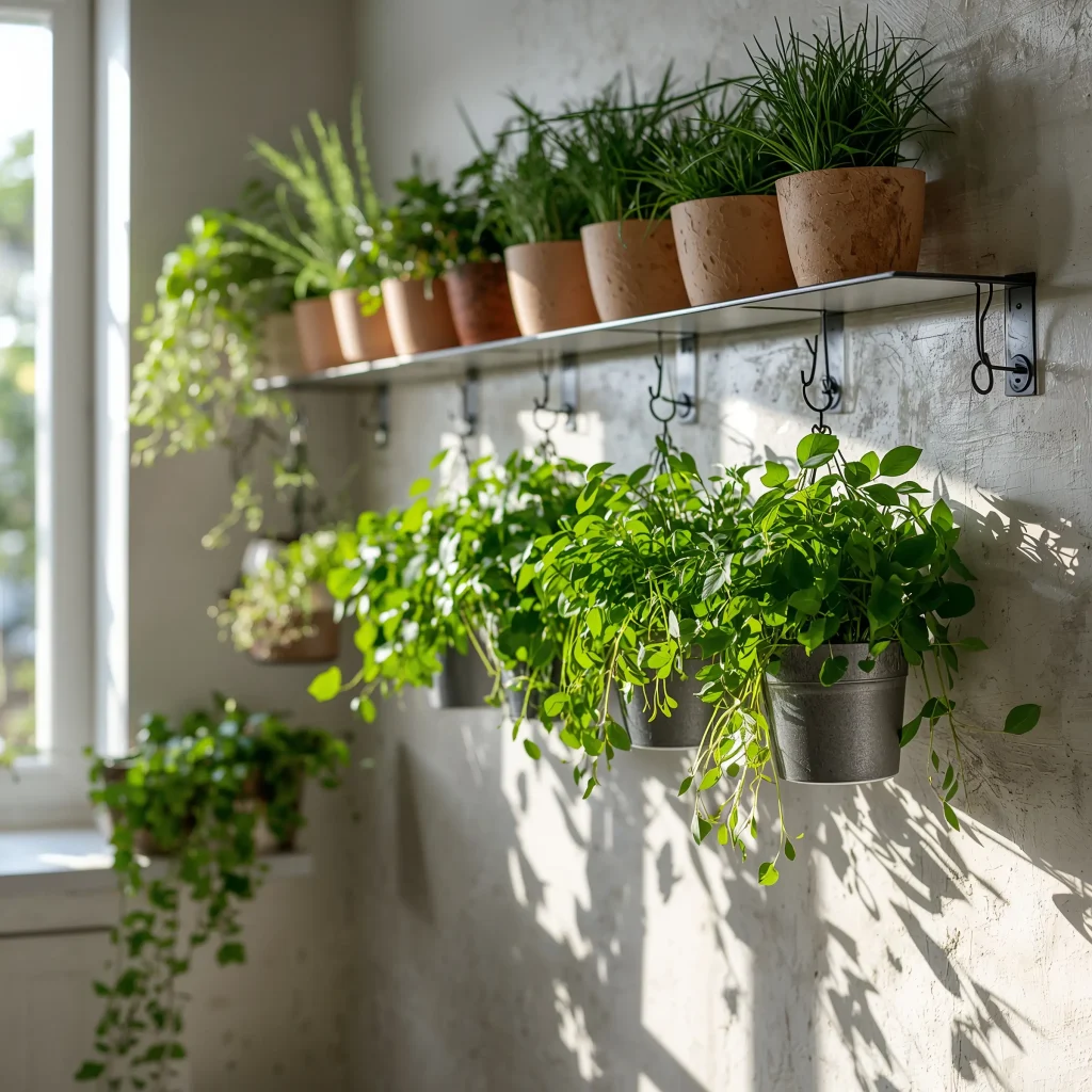 I use a combination of wall-mounted planters and a hanging rod system with S-hooks. Basil, oregano, thyme, and rosemary thrive in my south-facing kitchen window area. Even my notorious plant-killing tendencies haven’t managed to destroy these yet.