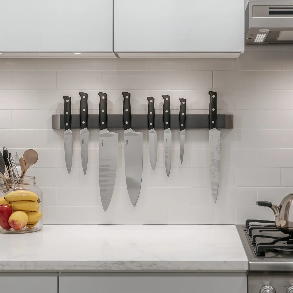 Forget that bulky knife block eating up counter space. A magnetic knife strip mounted on your wall looks sleek, saves space, and actually keeps your knives sharper since they’re not banging around in a drawer.
