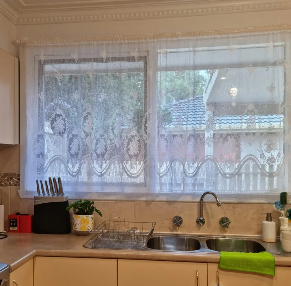 Last but not least, a classic approach done beautifully. These lace curtains feature a circular geometric pattern that’s detailed without being overly fussy. They’re hung over multiple windows, creating a cohesive, finished look across the entire sink area.