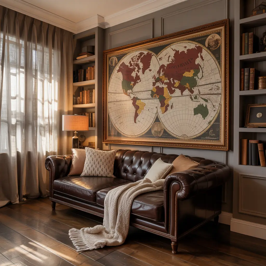 Frame your map in a sleek modern frame to bridge old and new. Or go frameless and use map pins to mark your travels. Just maybe skip the string-between-pins thing – we’re going for chic, not conspiracy theorist. 😉