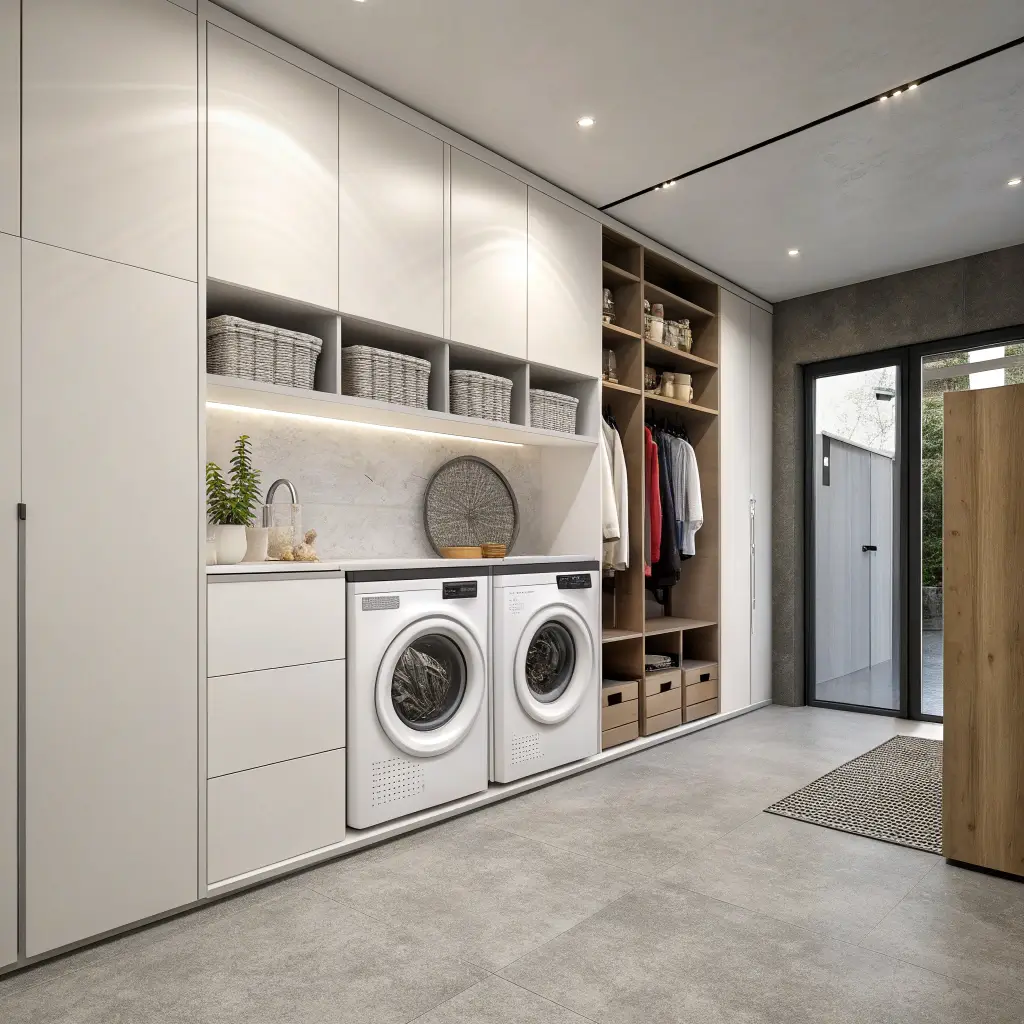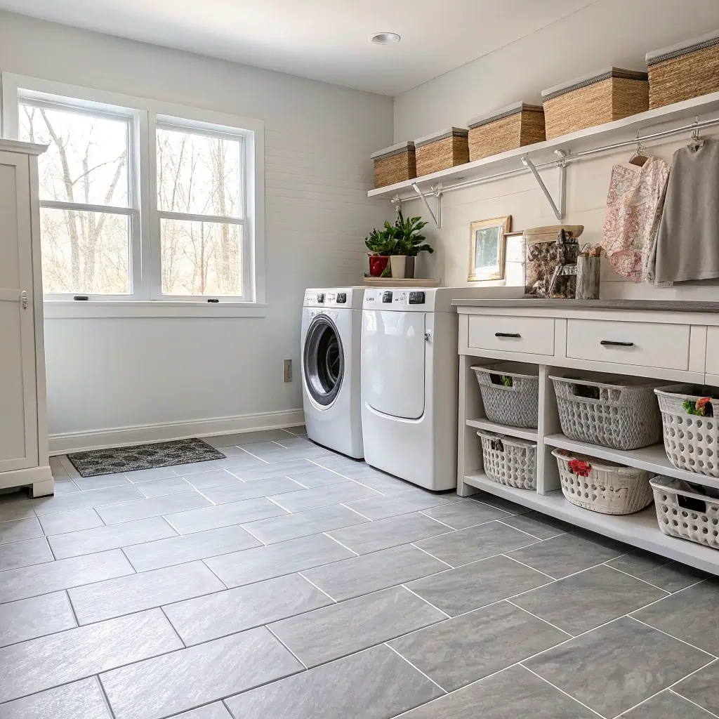 I’m talking about 24×24 inch porcelain tiles in soft gray or warm white. Minimal grout lines, maximum impact. My neighbor went this route and paired it with handleless white cabinets and hidden storage. The result? A laundry room that looks like it belongs in a Swedish design magazine.