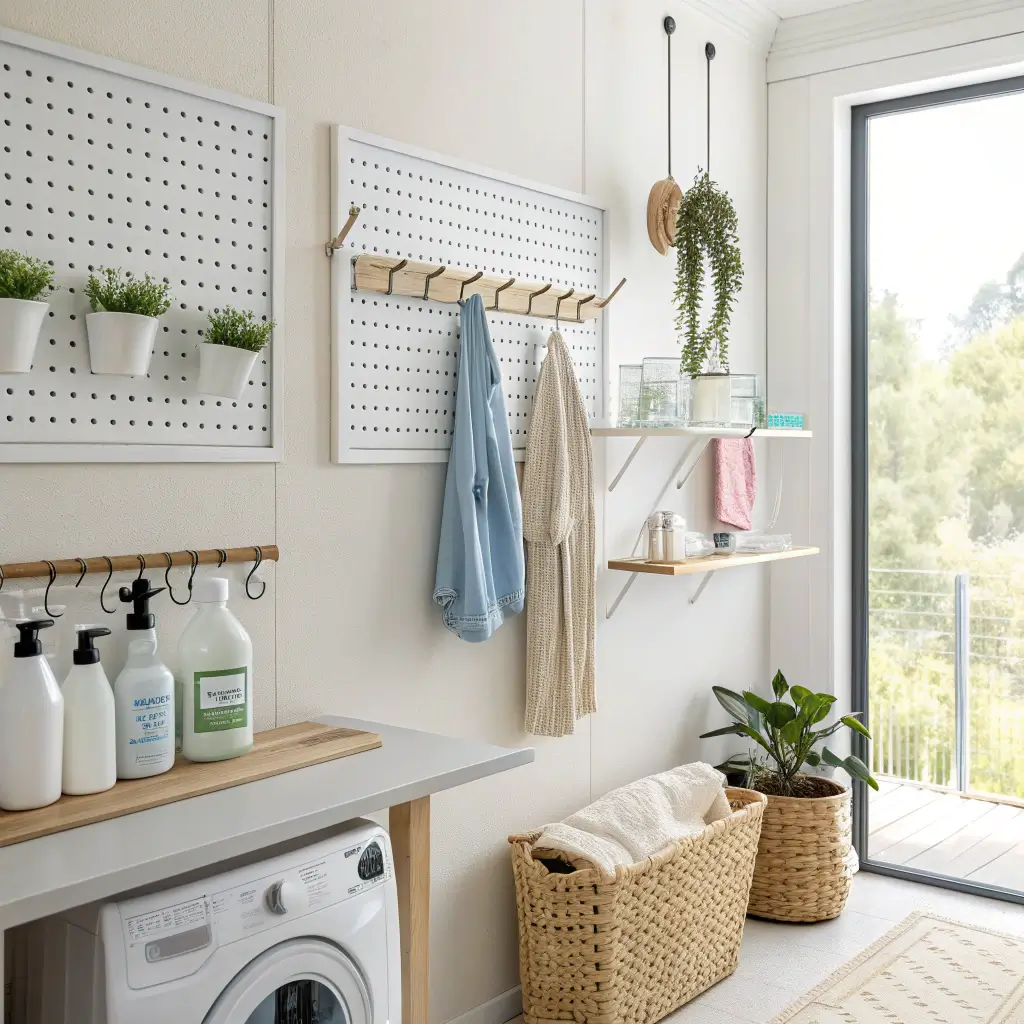 Who says pegboards are just for garages? I installed a 2×4 foot pegboard on my laundry room wall, and it’s basically command central for all my tools and supplies. Lint rollers, scissors, measuring cups for detergent, that weird brush thing for cleaning the dryer vent – everything has its spot.
