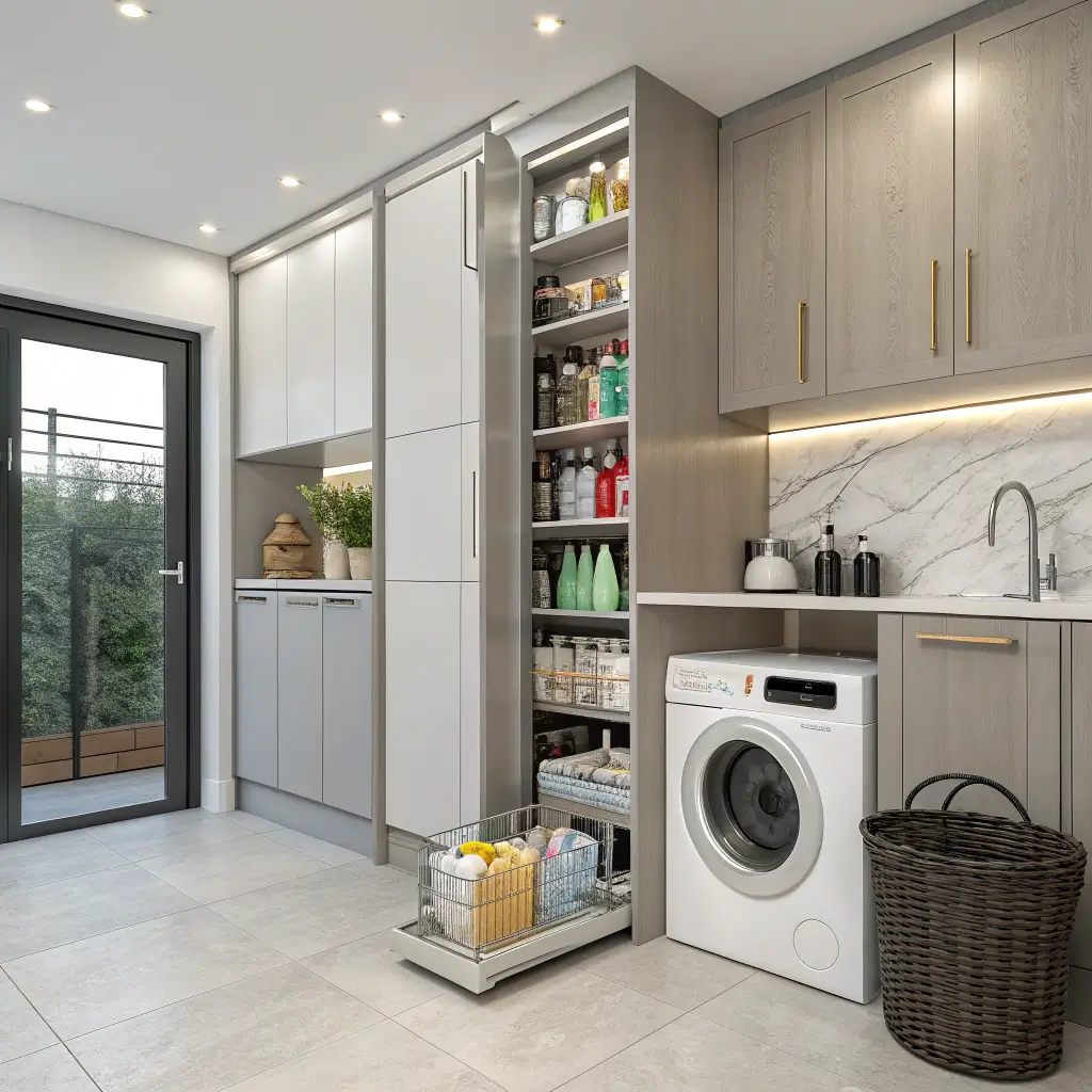 Ever seen those narrow pull-out pantries people install in kitchens? They work brilliantly in laundry rooms too. I squeezed a 6-inch wide sliding unit into the gap beside my water heater, and it holds an insane amount of supplies.